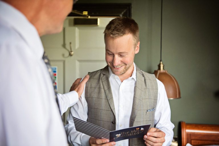 On the morning of the wedding, I spent time with Scot as he opened a gift from Amy — one of those simple, heartfelt moments that perfectly sets the tone. Nothing staged. Nothing rushed. Just the two of them, a little anticipation, and a quiet pause before the day unfolded.